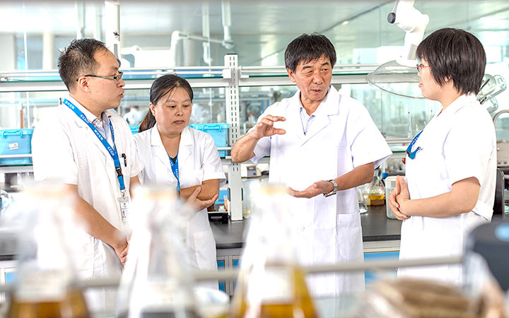 晨光生物董事長兼總經理盧慶國(右二)與黨員、技術骨干奮戰(zhàn)在科技創(chuàng)新一線。